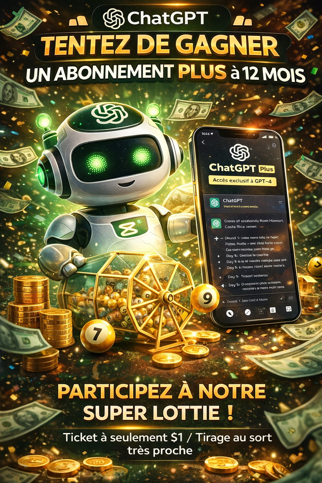 Tente ta chance et gagne un abonnement ChatGPT Plus en jouant à notre loterie à petit prix.